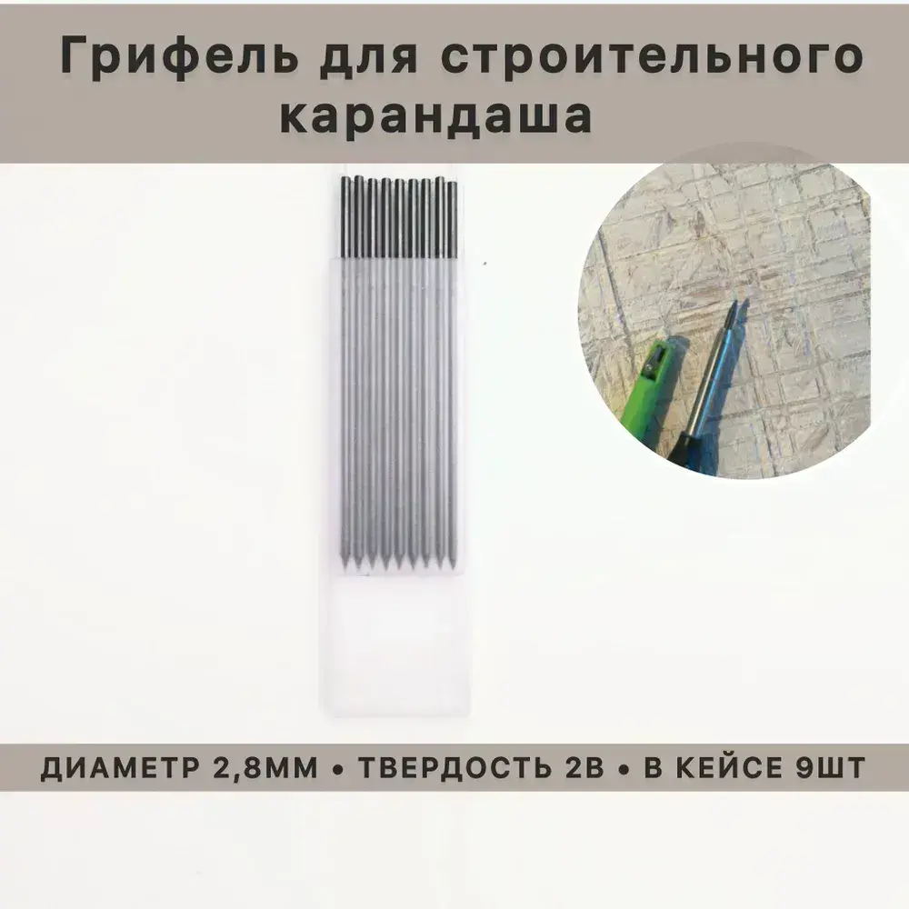 Грифель для строительного механического карандаша 2,8мм, твердость 2В. Набор сменных стержней-грифелей к механическим карандашам. В кейсе 9шт.