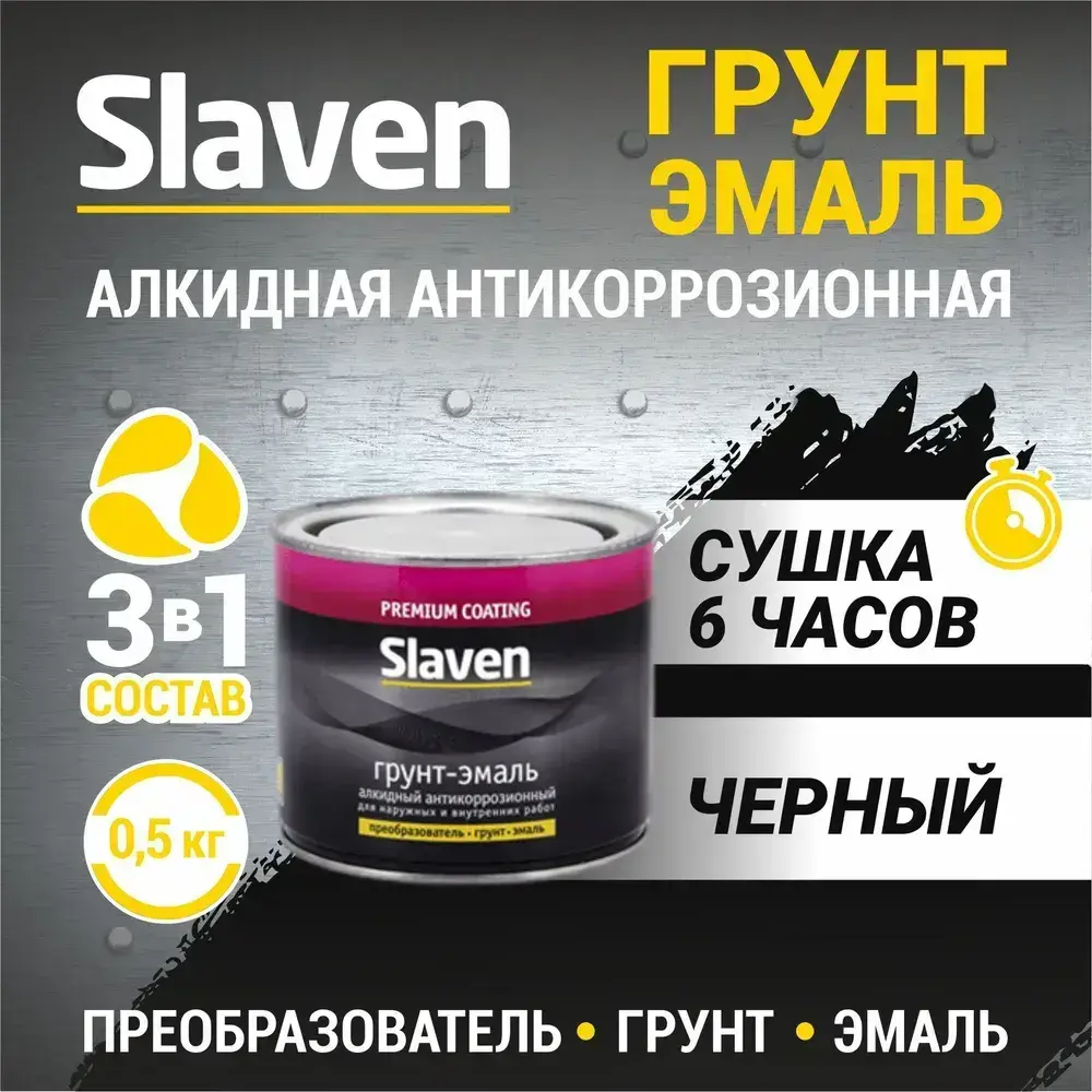 Грунт-эмаль SLAVEN 3 в 1, краска по металлу, по ржавчине, быстросохнущая, полуматовое покрытие, черный RAL 9005, 0.5 кг