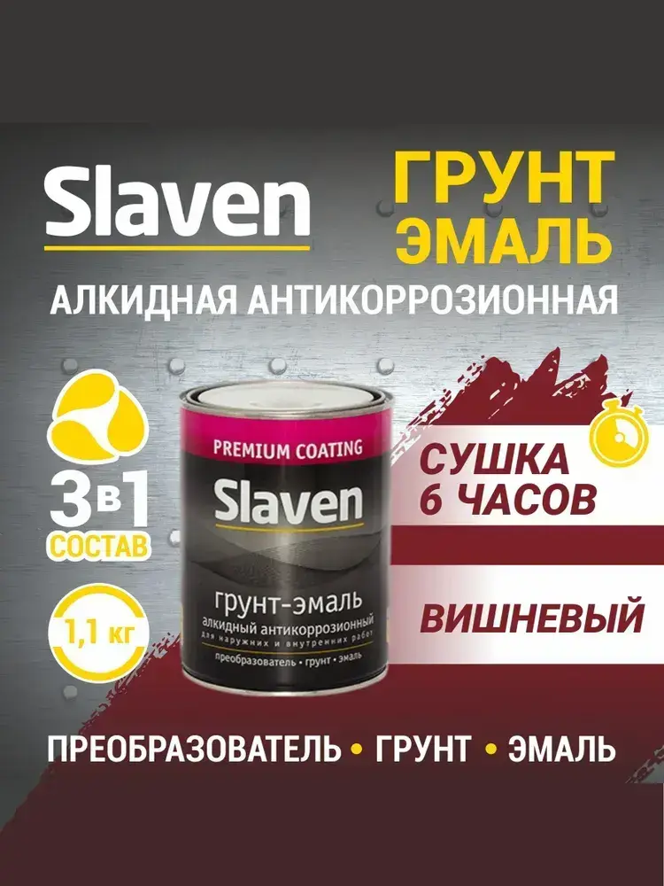 Грунт-эмаль SLAVEN 3 в 1, краска по металлу, по ржавчине, быстросохнущая, полуматовое покрытие, вишневый RAL 3005, 1.1 кг
