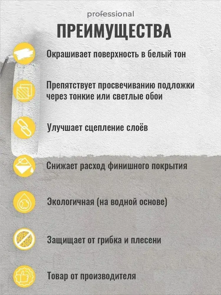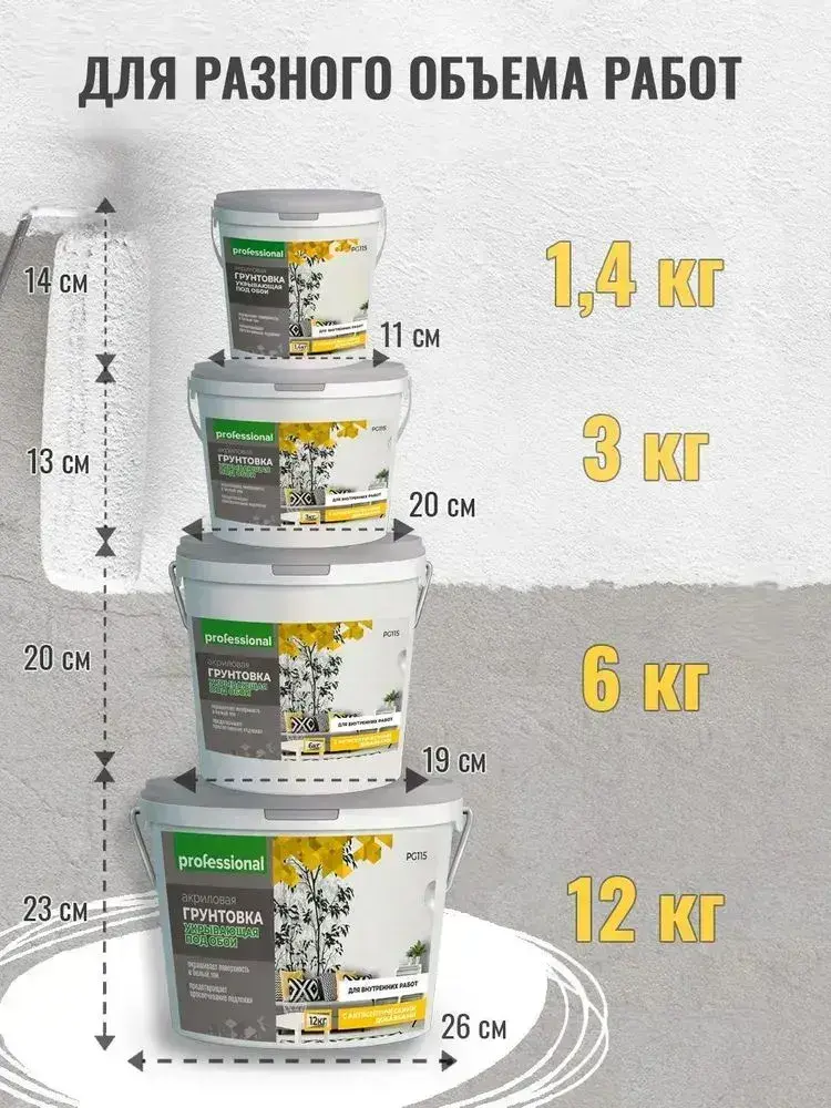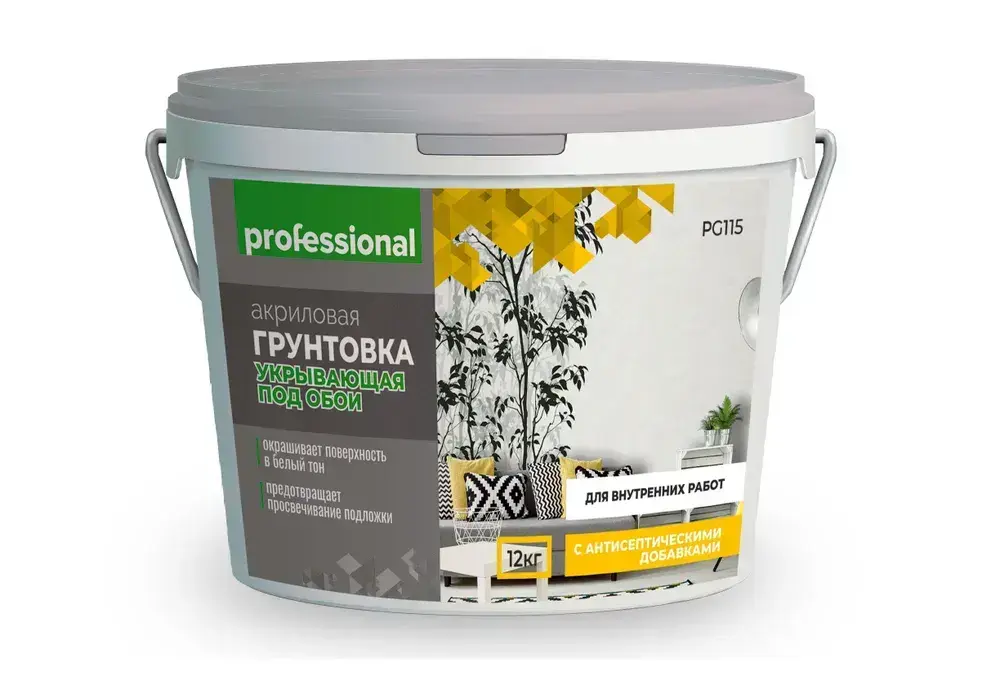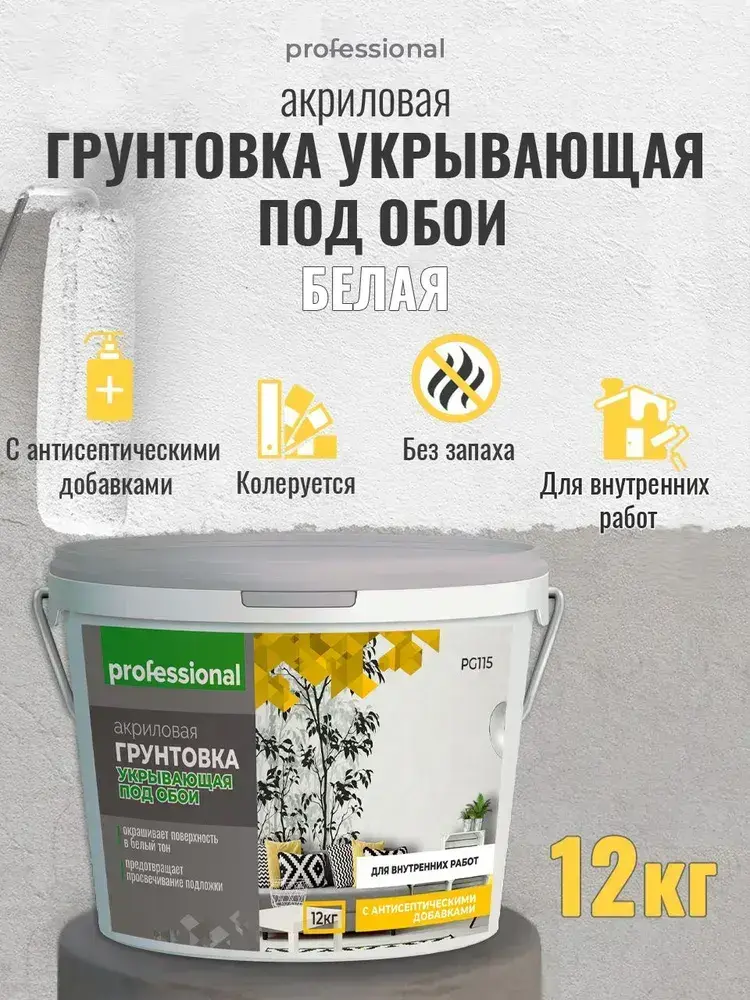 Грунтовка для стен под обои акриловая PROFESSIONAL пигментированная укрывающая белая с антисептиком без запаха для внутренних работ 12кг, грунтовка под жидкие обои