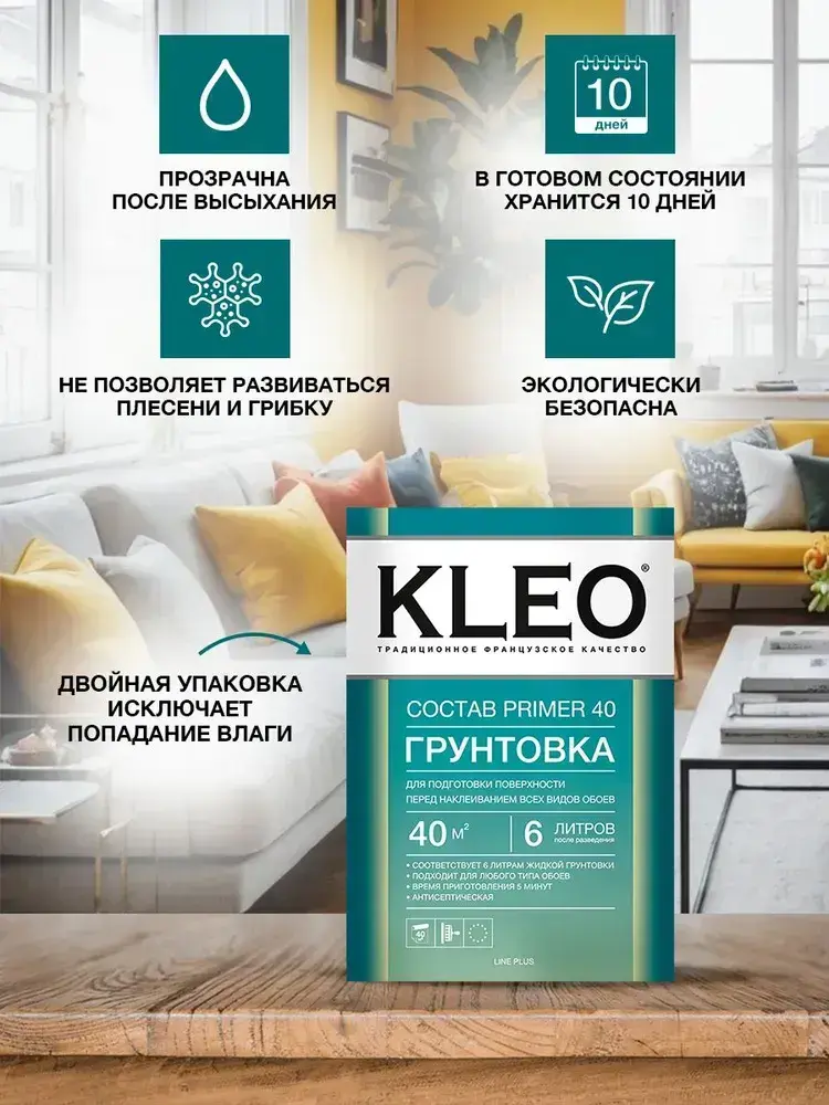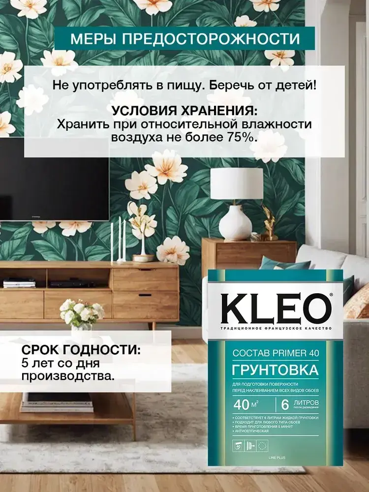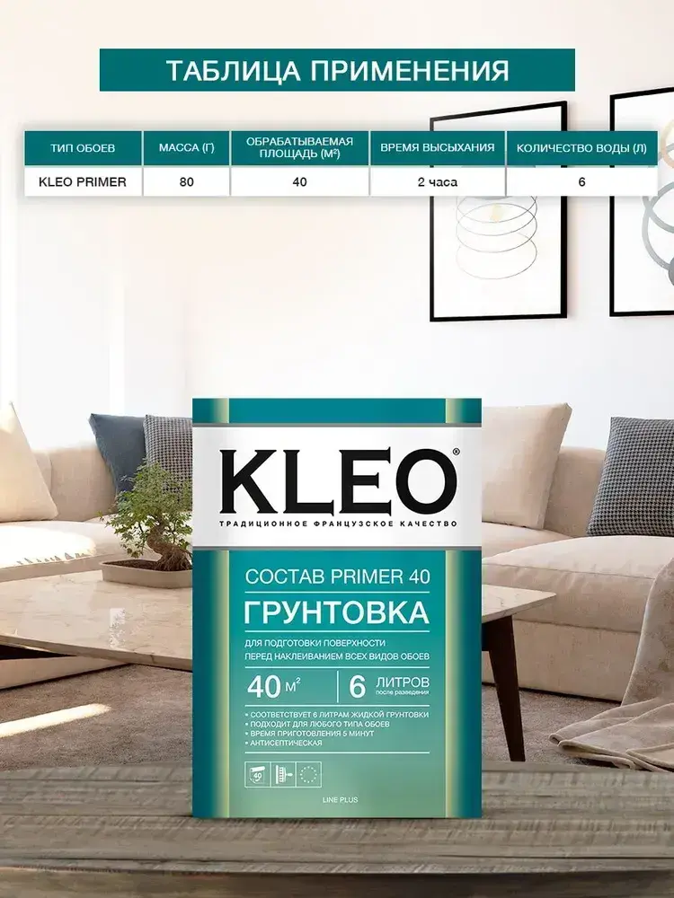 Грунтовка для стен под обои KLEO PRIMER 40 , для подготовки поверхности перед наклеиванием всех видов обоев, на 40 кв.м. 80 гр