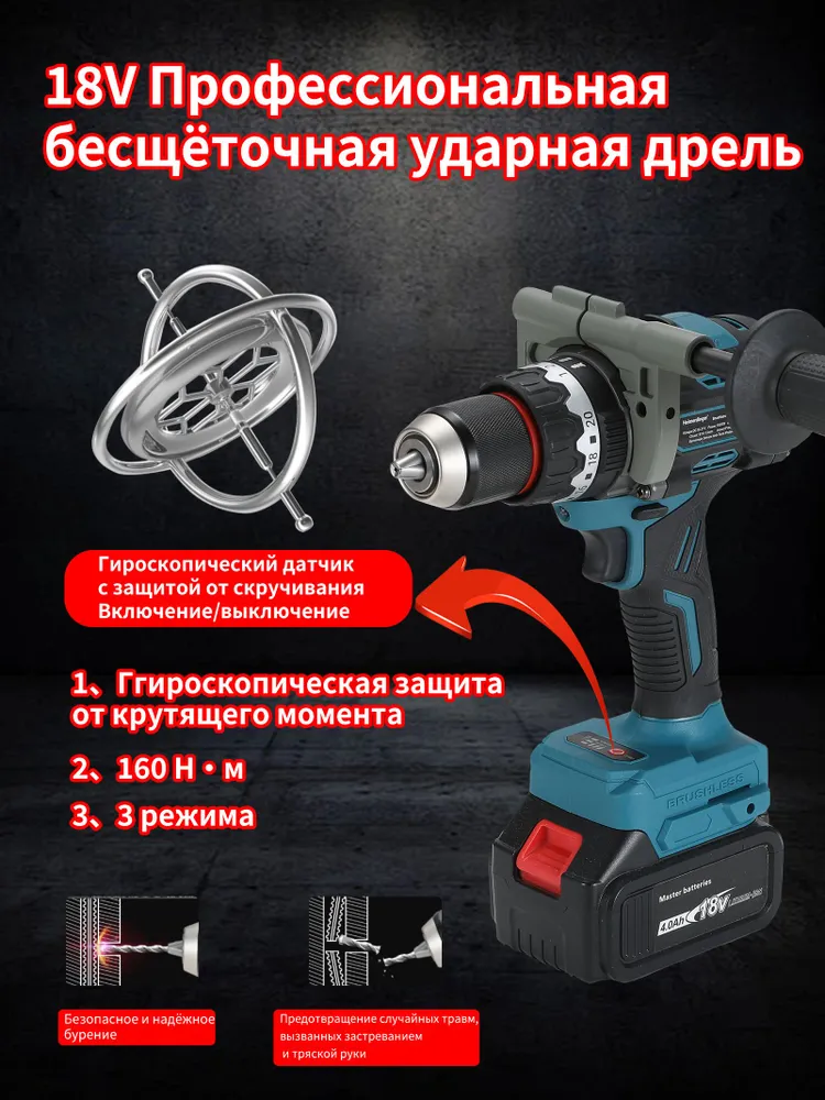 Heimerdinger бесщеточная ударная дрель 18В 160 Н м + гироскоп 3 режима без рукоятки (профессиональный инструмент для бетона)