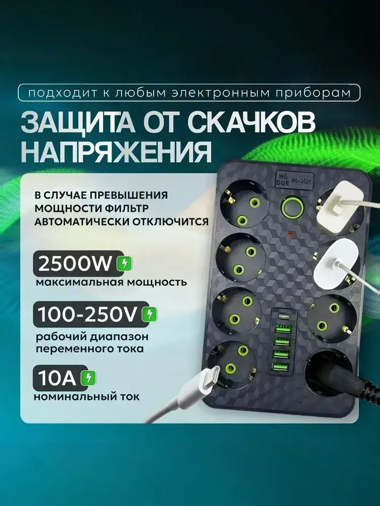 HG-2508, Сетевой фильтр 3 м / Удлинитель с USB (юсб) и Type-C / 8 розеток, тройник для розетки, пилот