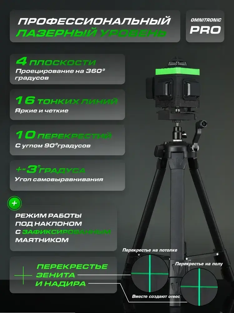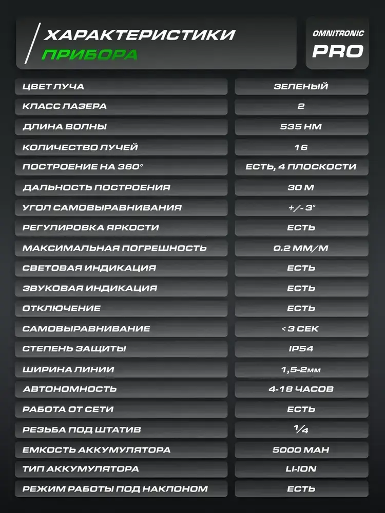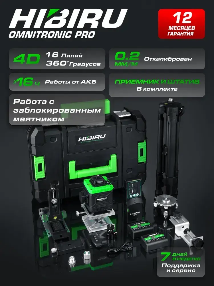 HIBIRU / Профессиональный лазерный уровень 4D со штативом и приемником зеленый луч Omnitronic PRO дальность 30м, 16 лучей 360 градусов, самовыравнивание, пульт, откалиброван, гарантия, полный комплект