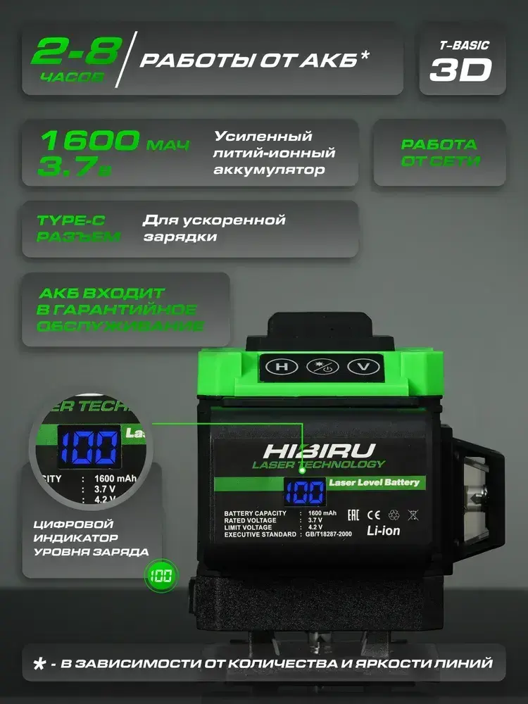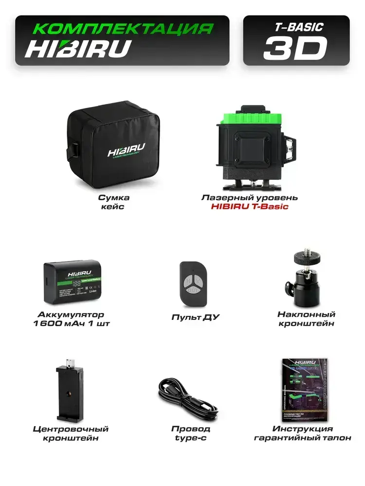 HIBIRU / Профессиональный лазерный уровень нивелир 3D зеленый луч T-Basic дальность 30м, 12 лучей 360 градусов, самовыравнивание, кейс, пульт, откалиброван, гарантия