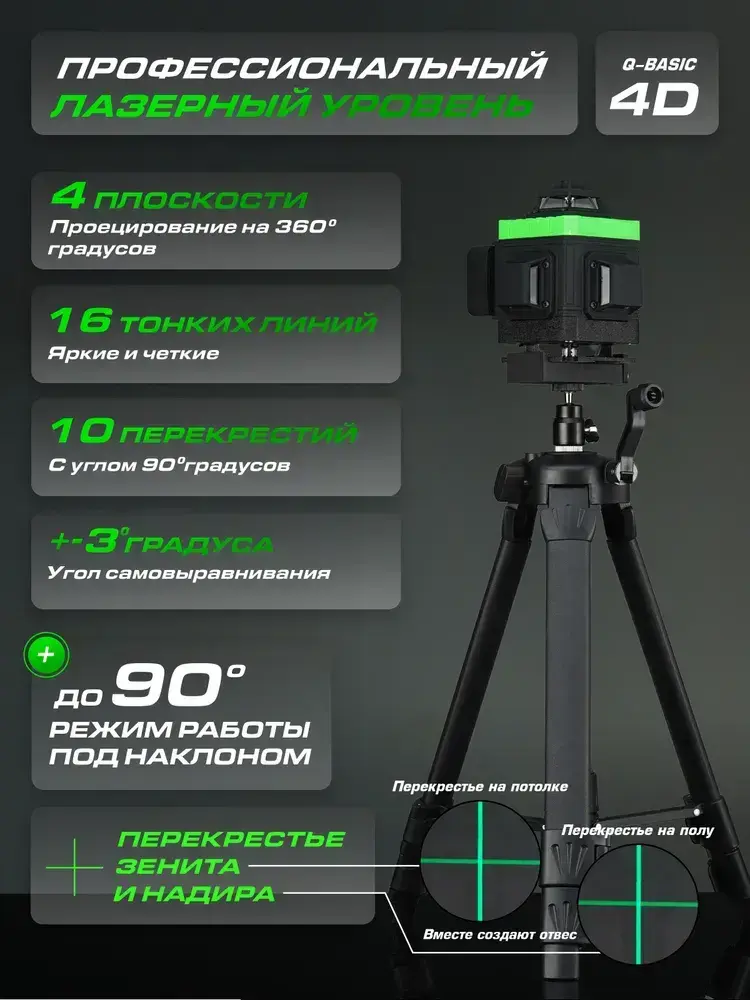 HIBIRU / Профессиональный лазерный уровень нивелир 4D зеленый луч Q-Basic дальность 30м, 16 лучей 360 градусов, самовыравнивание, 2 АКБ кейс, пульт, магнитное крепление, откалиброван, гарантия