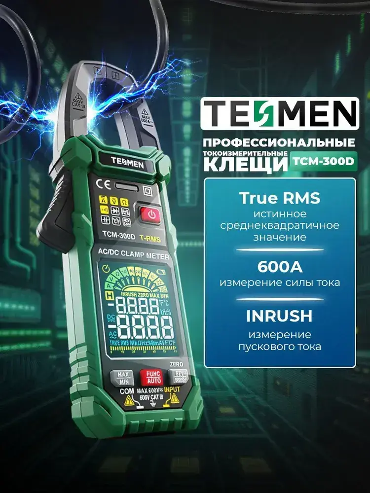 INRUSH Токовые клещи TCM-300D 6000 отсчетов T-RMS Строительный/измерительный электрический тестер для ремонта и проводки клещевой