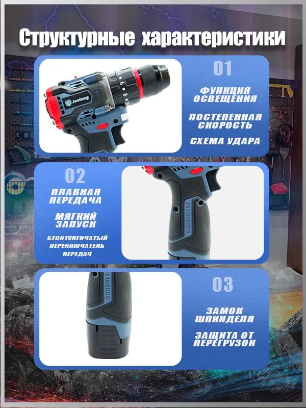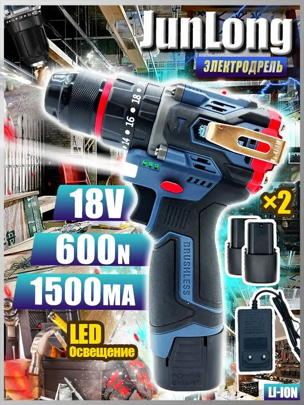 Junlong Дрель-шуруповерт, 18 В, 600 Нм, 2 АКБ