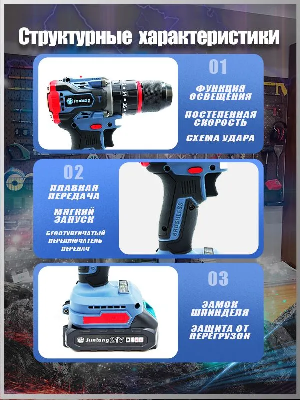 Junlong Дрель-шуруповерт, 21 В, 600 Нм, 2 АКБ