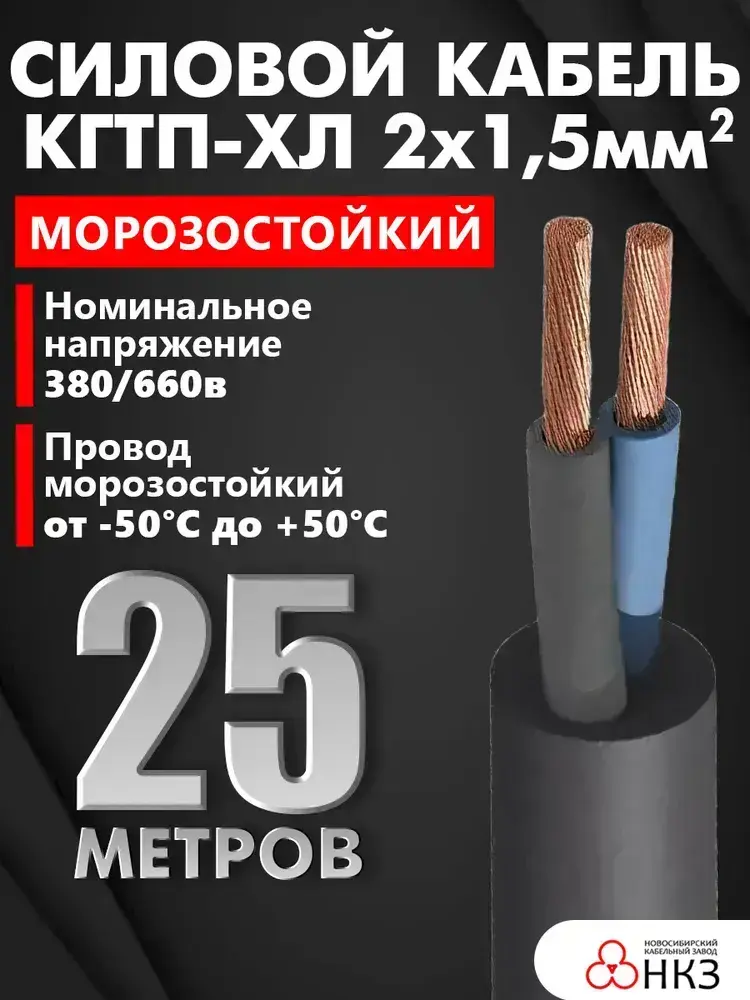 Кабель КГ тп - ХЛ морозостойкий 2х1,5 мм2 220/380, черный, 25 м