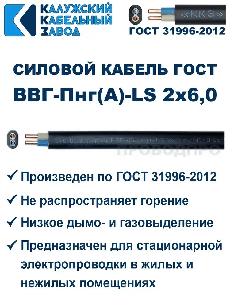 Кабель ВВГ-Пнг(А)-LS 2х6,0 ГОСТ, 10 метров, Калужский кабельный завод