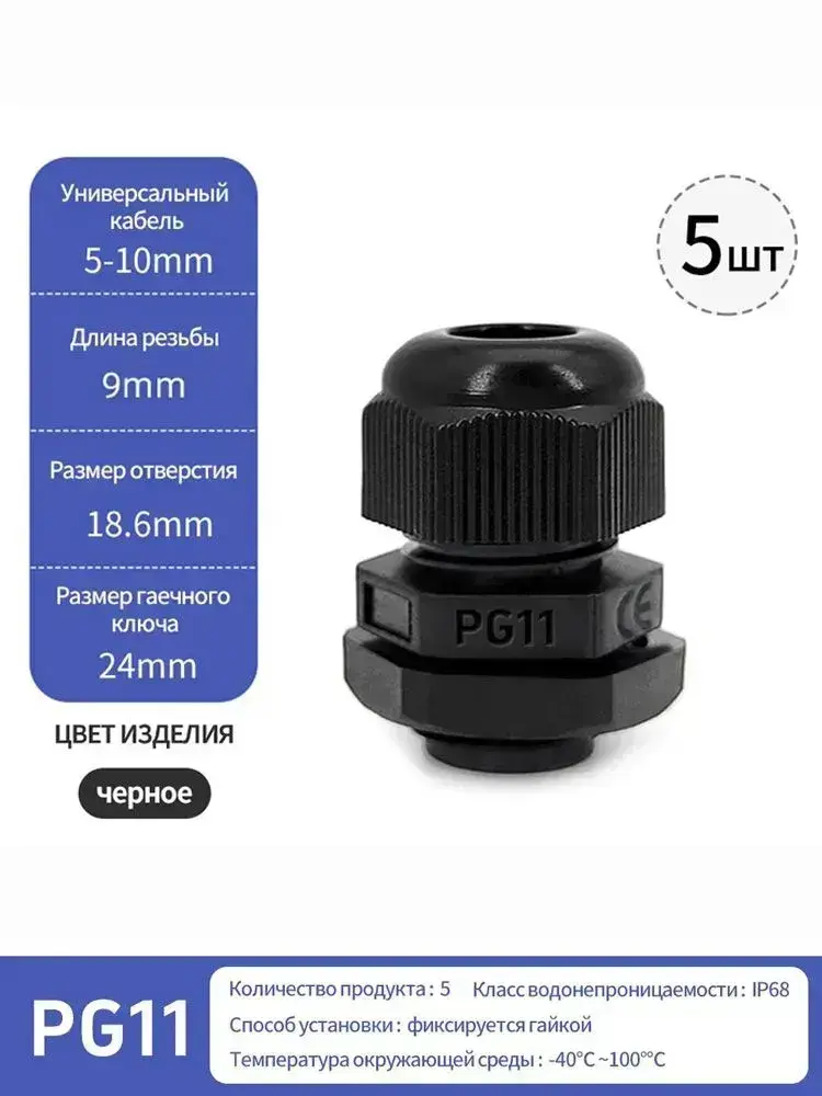Кабельный ввод (сальник) PG11(5-10 мм, IP68) 5 шт.