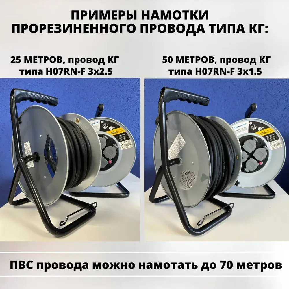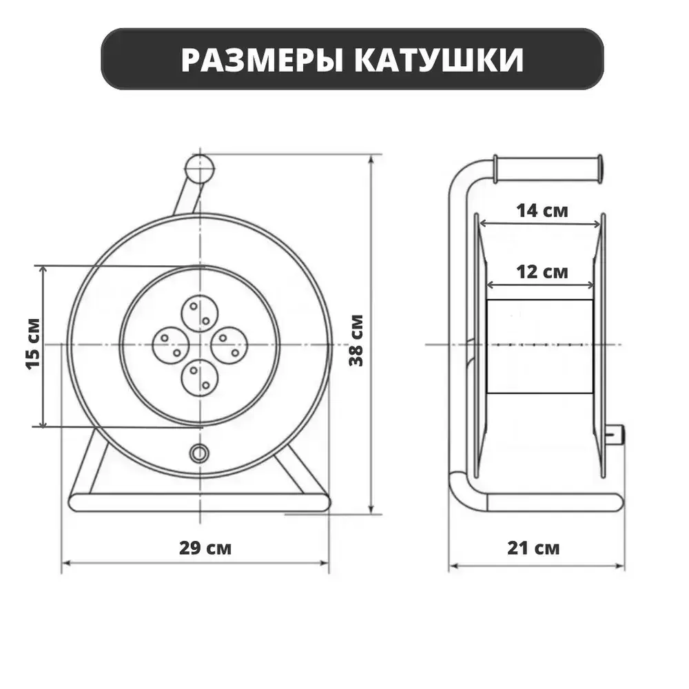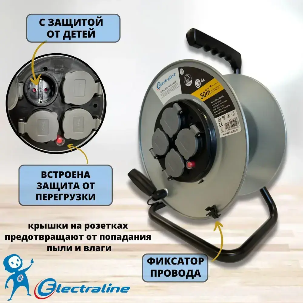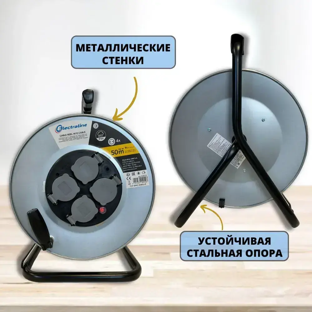 Катушка металлическая для удлинителя Electraline 4 розетки без провода до 70 метров с заземлением