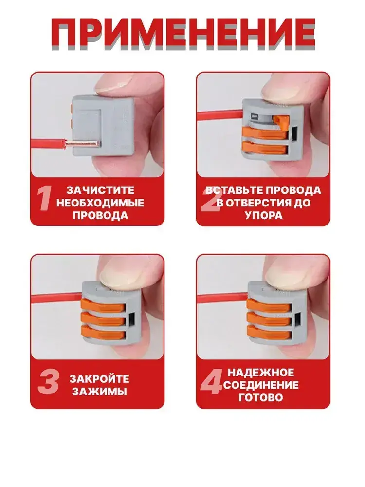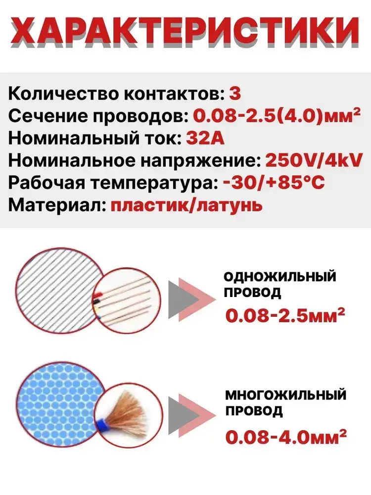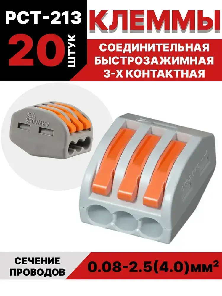 Клеммы для проводов зажимные монтажные 3-х контактные 20 шт / соединитель клеммный 0.08-2.5(4.0)мм2 32А РСТ-213