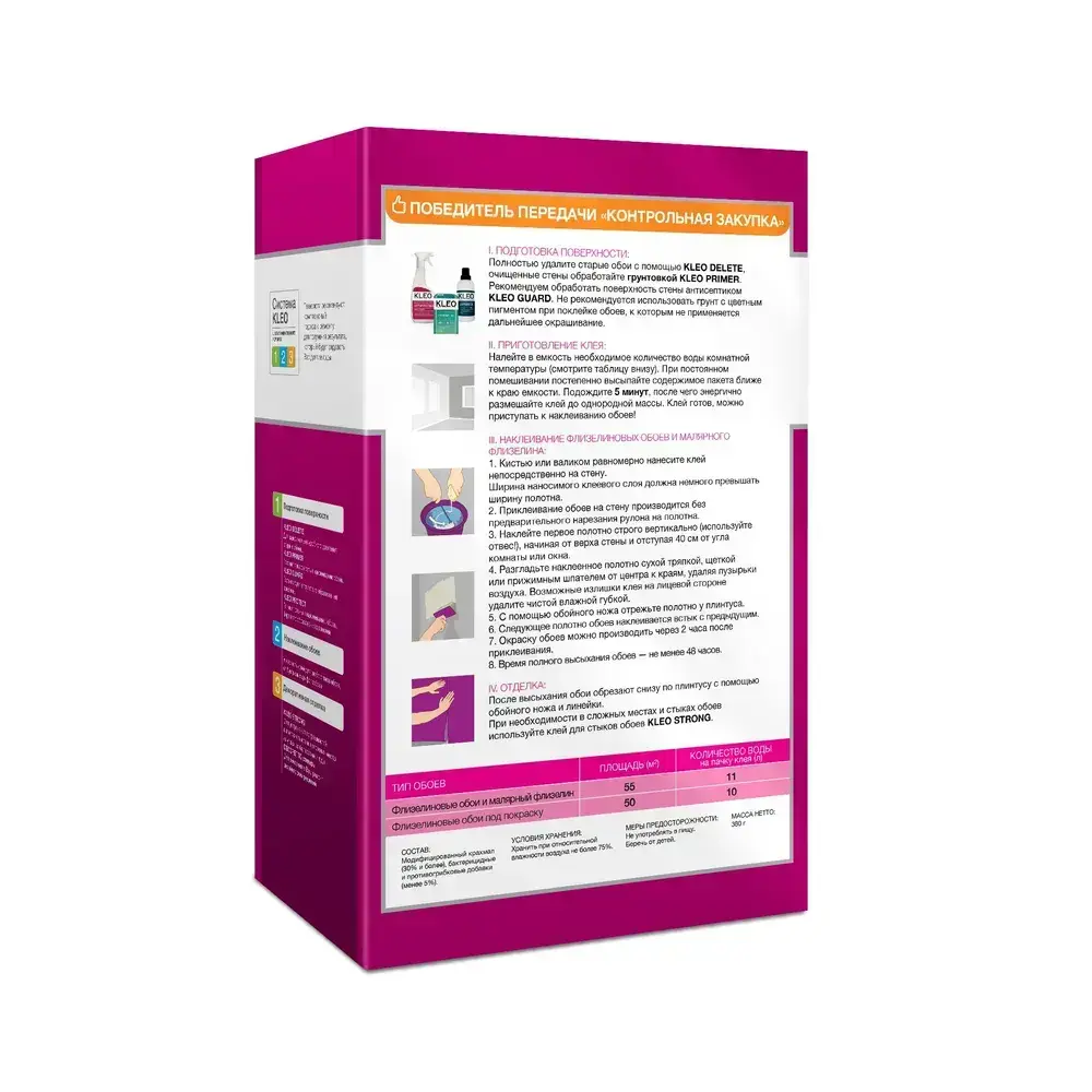 Клей для обоев KLEO EXTRA 55 усиленная формула,обойный клей для виниловых, флизелиновых, бумажных, для обоев на основе малярного флизелина, антигрибковая и антисептическая формула Клео Экстра