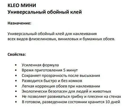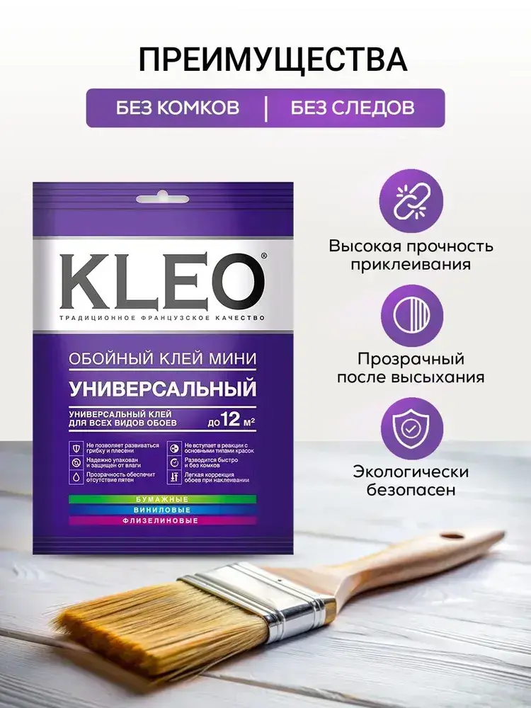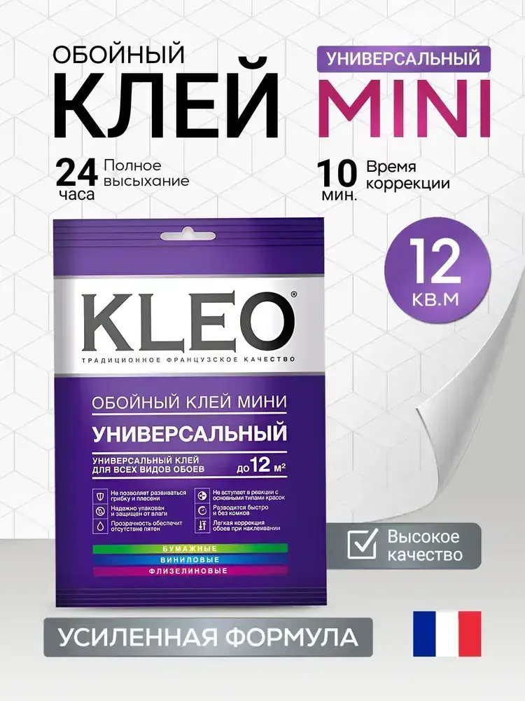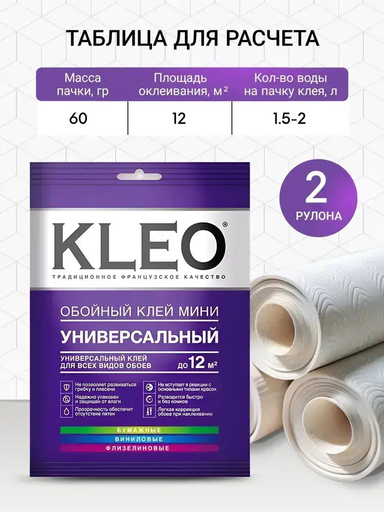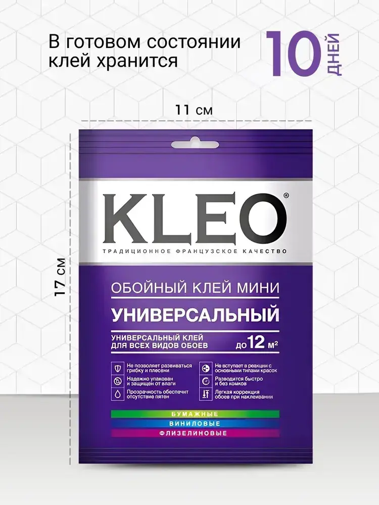 Клей для обоев KLEO MINI на 12 кв.м, обойный клей универсальный для всех видов флизелиновых, виниловых и бумажных обоев 60г.