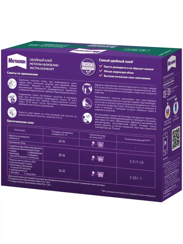Клей для обоев Метилан Флизелин Экстра Комфорт 200 г 36 м2, для всех типов флизелиновых обоев и стеклообоев, виниловых, бумажных, универсальный