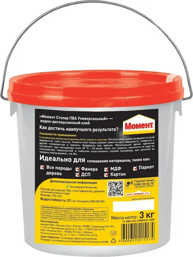 Клей столярный водно-дисперсионный Момент Столяр ПВА Универсал 3 кг.