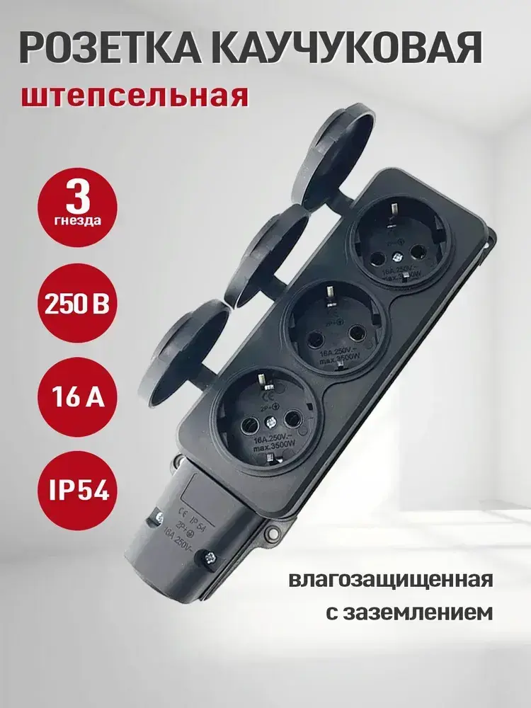Колодка розеточная электрическая каучуковая с заземлением на 3 розетки, IP 54,черный