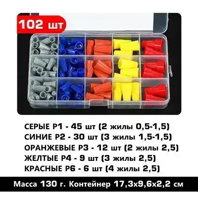 Колпачки СИЗ: набор 102 шт соединительных зажимов для скрутки проводов при электромонтаже