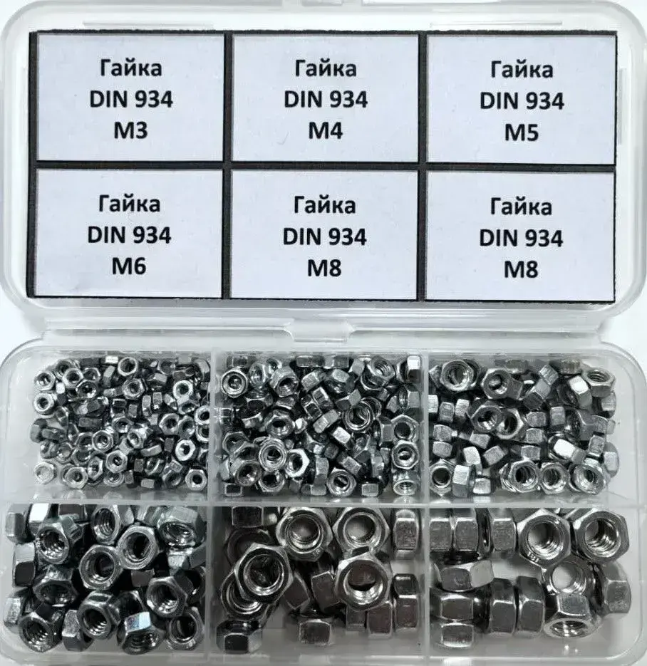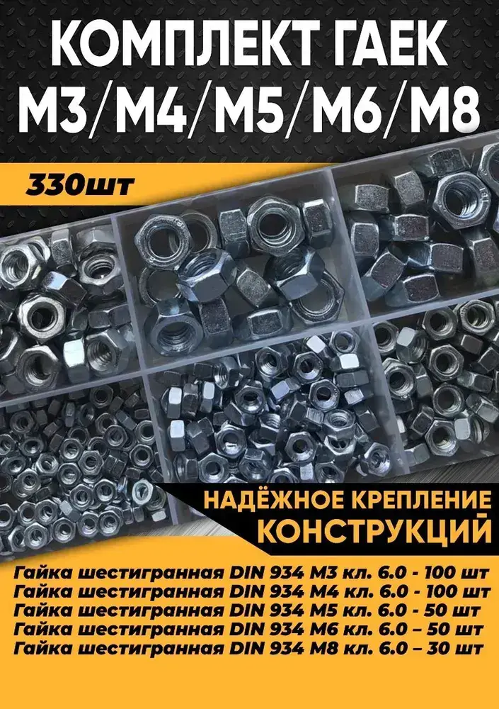Комплект гайка М3, М4, М5, М6, М8 - 330 шт. в органайзере / гайка шестигранная/набор гаек