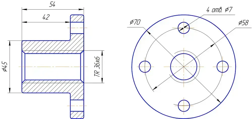 Комплект TR 36x6 Трапецеидальный винт, трапецеидальная гайка бронзовая с фланцем.