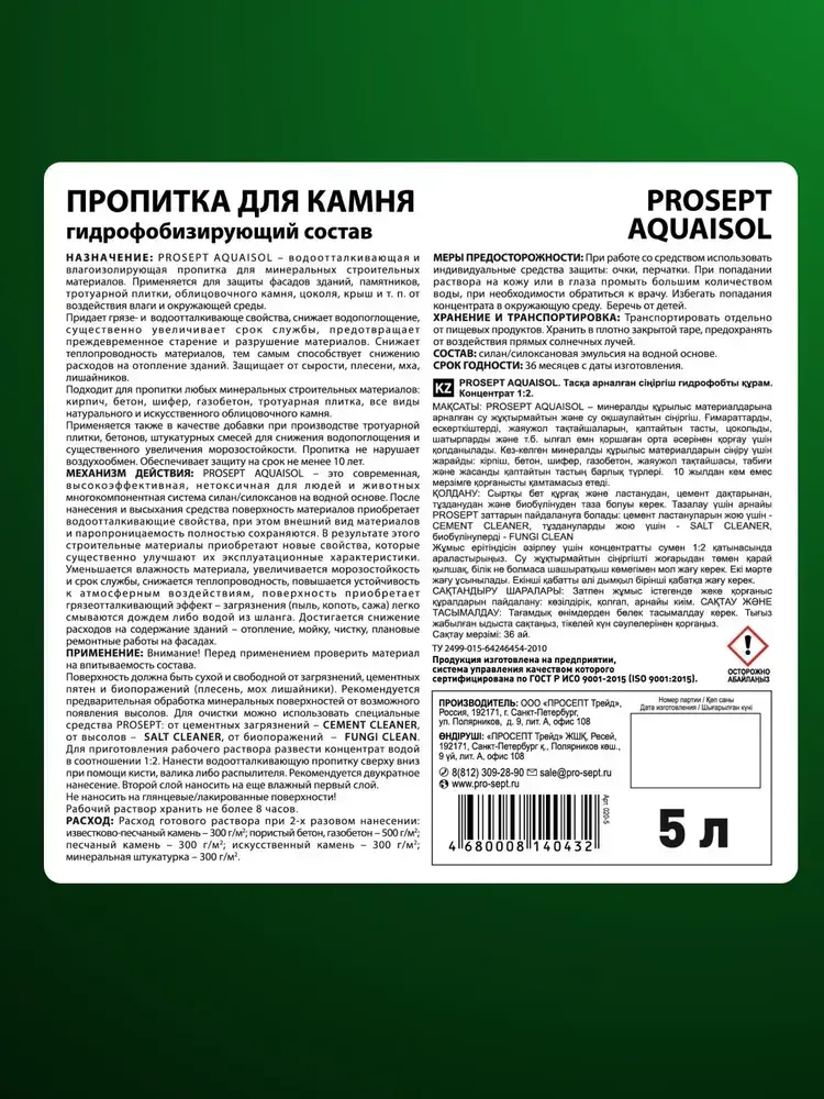 Концентрат 1:2 Гидрофобизатор пропитка водоотталкивающая для камня, бетона, кирпича, тротуарной плитки PROSEPT бесцветный матовый 5 л (арт. 020-5)