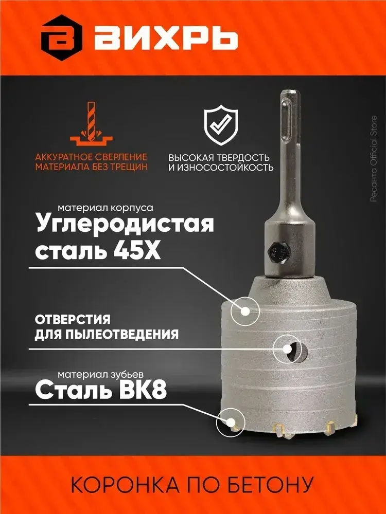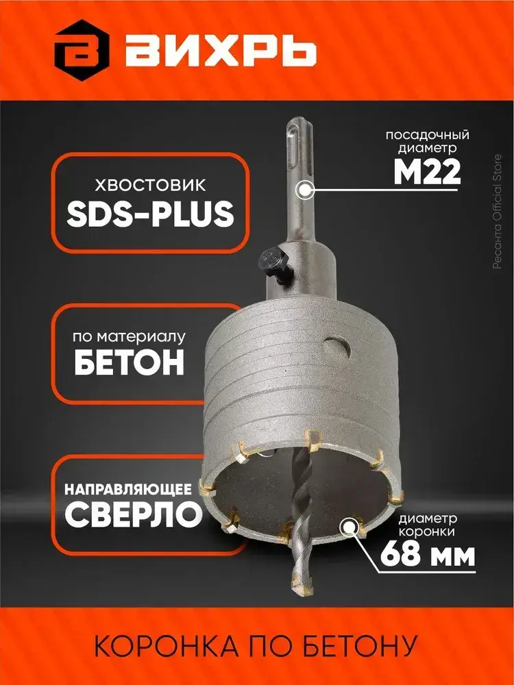 Коронка по бетону М22 х 68 мм, SDS PLUS, в сборе с хвостовиком Вихрь