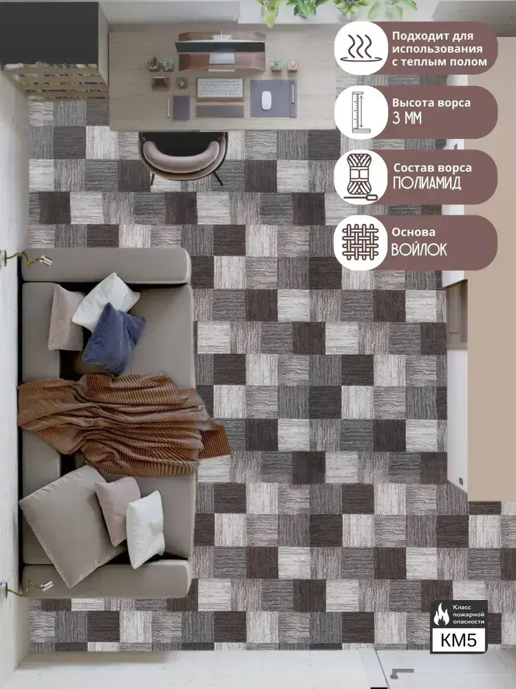 Ковролин метражом 2,5х2 м, безворсовой "Плитка", коричнево-серая с оверлоком