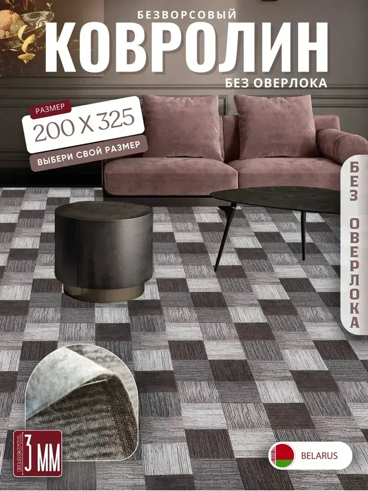 Ковролин метражом 2х3,25 м, безворсовой "Плитка", коричнево-серая без оверлока