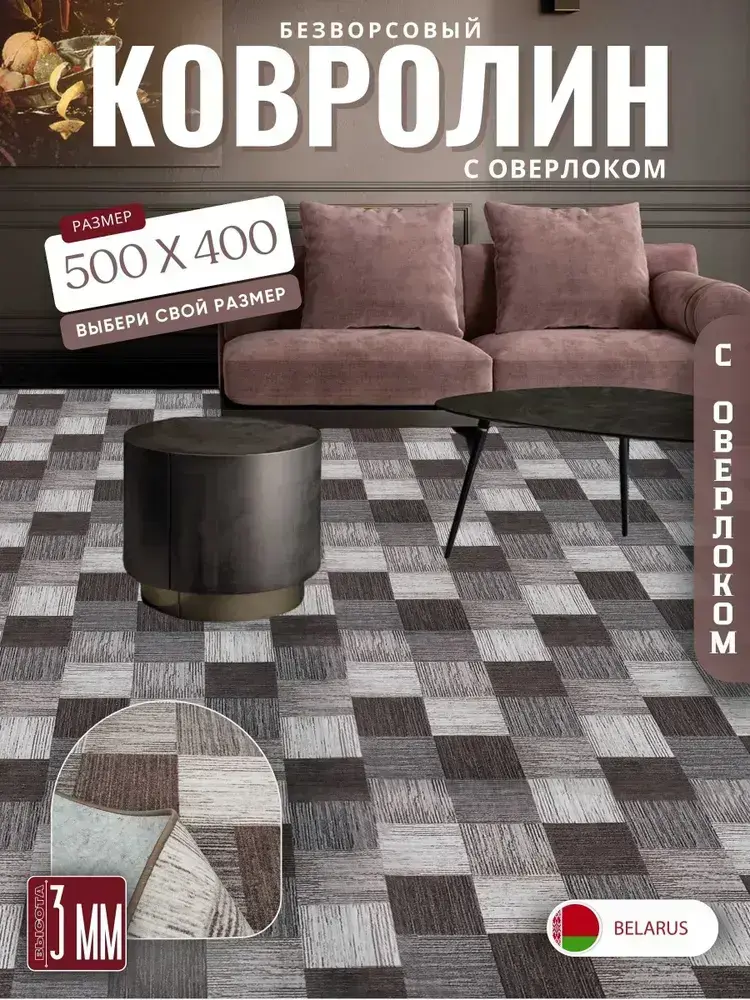 Ковролин метражом 5х4 м, безворсовой "Плитка", коричнево-серая с оверлоком