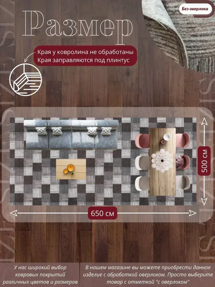 Ковролин метражом 5х6,5 м, безворсовой "Плитка", коричнево-серая без оверлока