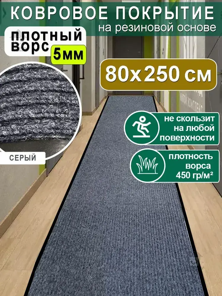Ковролин на резиновой основе 80х250 для дома и офиса Серый