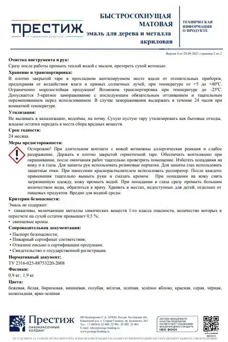 Краска БЕЛАЯ БЫСТРОСОХНУЩАЯ МАТОВАЯ 0,9 кг БЕЗ Резкого Запаха Престиж Эмаль для дерева и металла акриловая