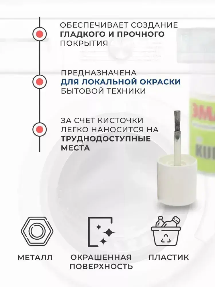 Краска для бытовой техники с кисточкой KUDO, алкидная, водостойкая, глянцевое покрытие, белая, 15 мл / для холодильников, стиральных и посудомоечных машин, микроволновых печей