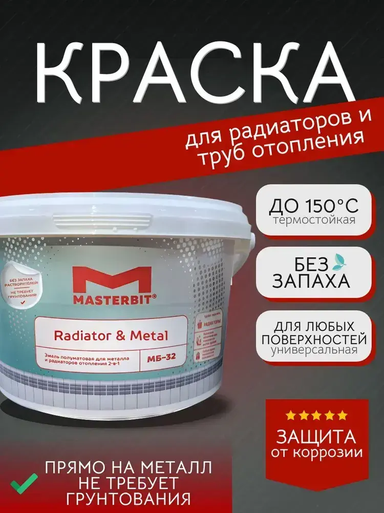 Краска для радиаторов и труб отопления без запаха МАСТЕРБИТ МБ-32 Белая (0,9 кг), не требует грунтования, прямо на металл, антикоррозионная, акриловая, быстросохнущая