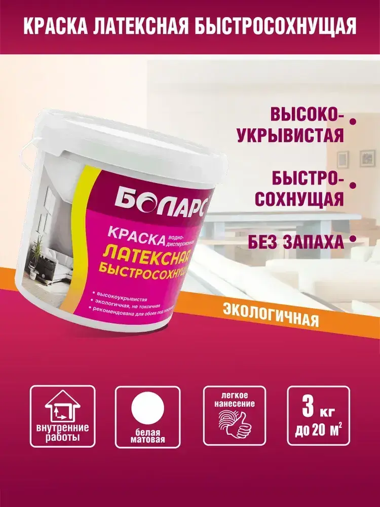 Краска латексная 3 кг для стен и потолков, моющаяся, белая, матовое покрытие, без запаха, быстросохнущая, для стеклообоев и обоев