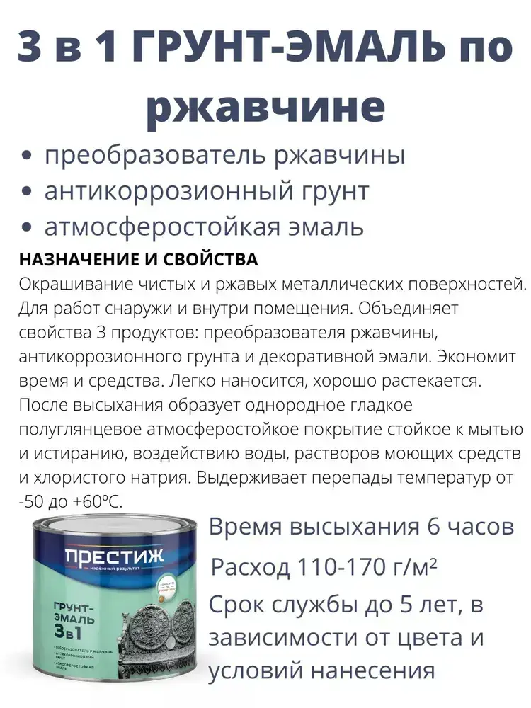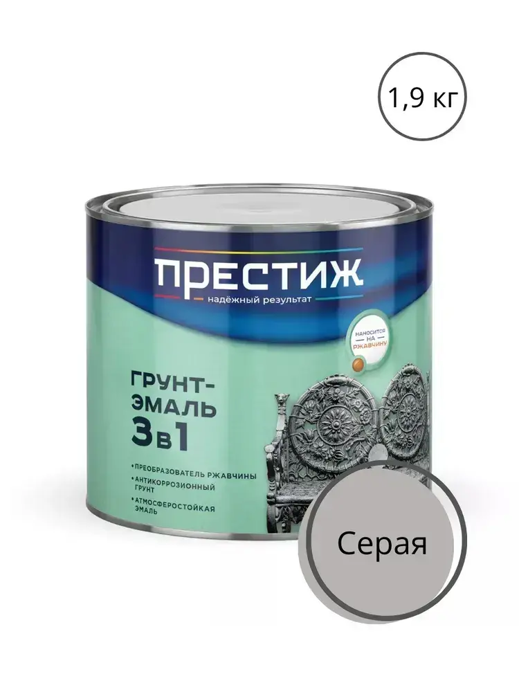 Краска по ржавчине для металла ПРЕСТИЖ, грунт эмаль по ржавчине 3 в 1, серая полуглянец 1,9кг