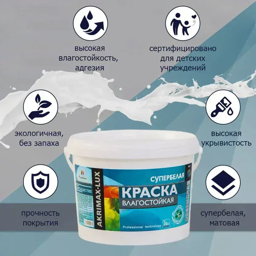 Краска Влагостойкая акриловая супербелая 3 кг AKRIMAX для помещений с повышенной влажностью, для стен, для кухонь, для ванных комнат, Матовое покрытие, белый