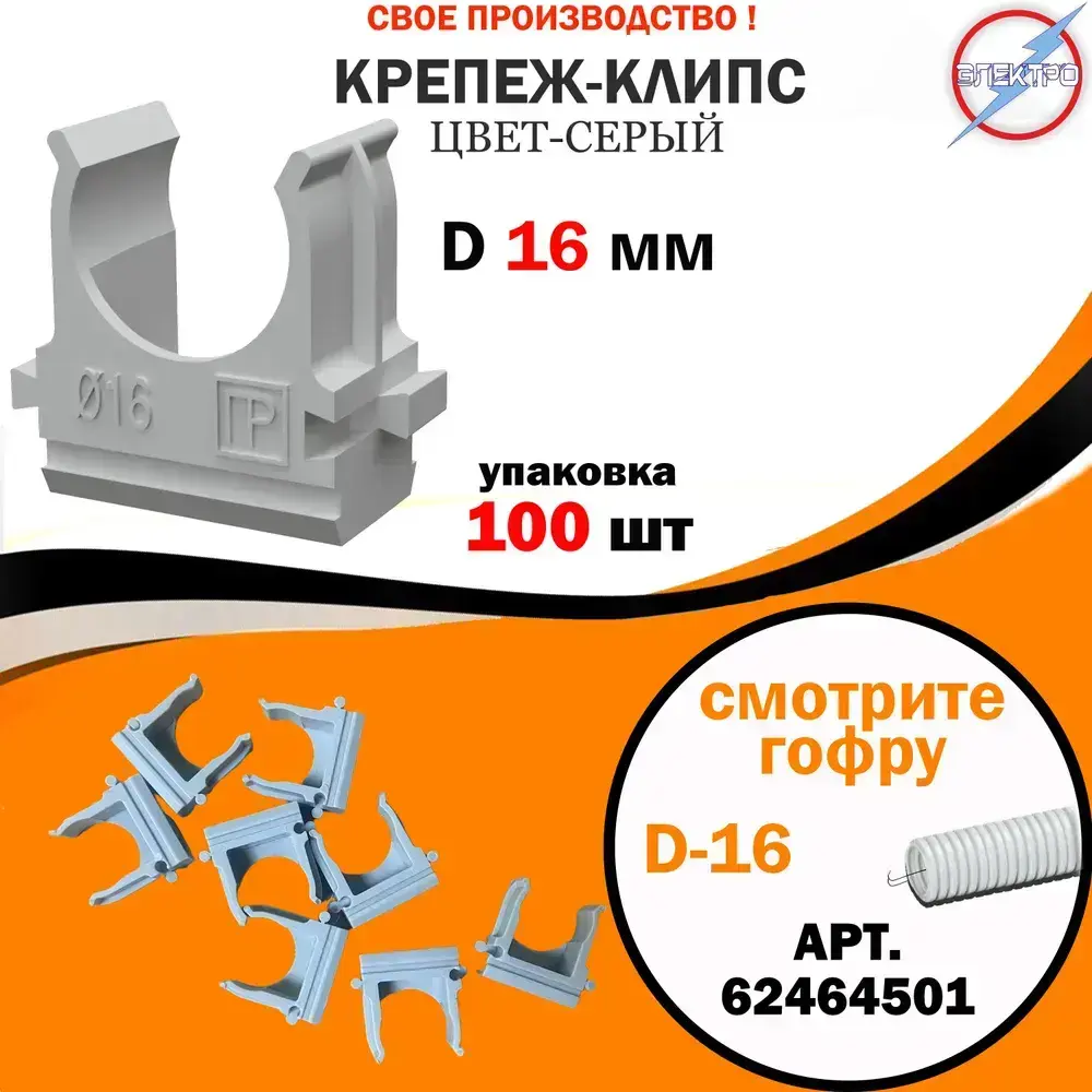 Крепёж-клипса для труб / гофры серая d16 (100шт)