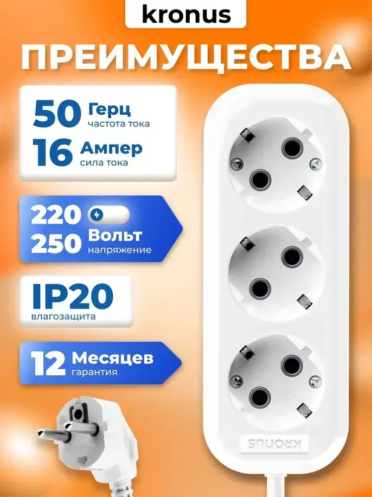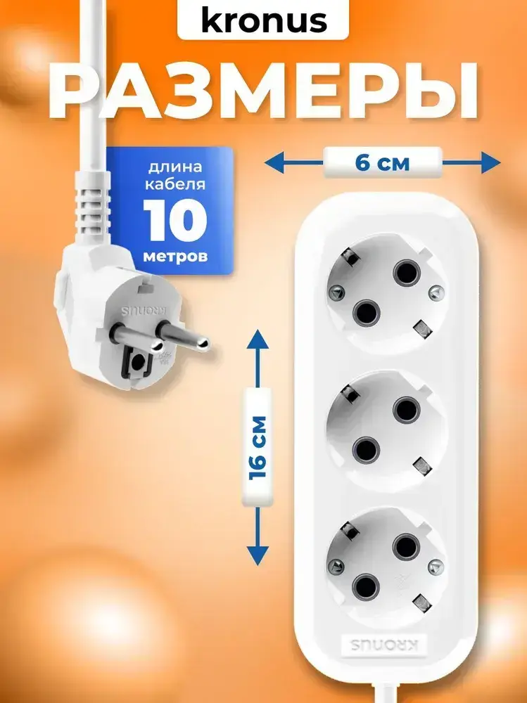 Kronus Удлинитель сетевой 10м 3 розетки с заземлением