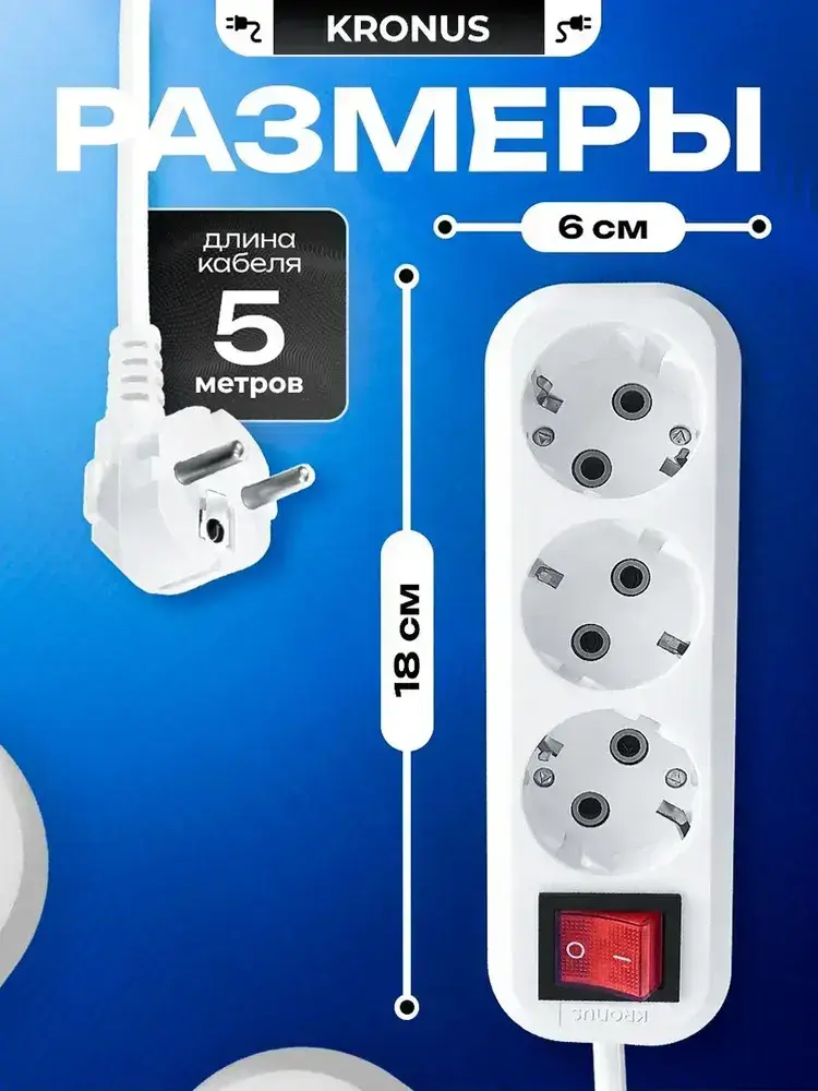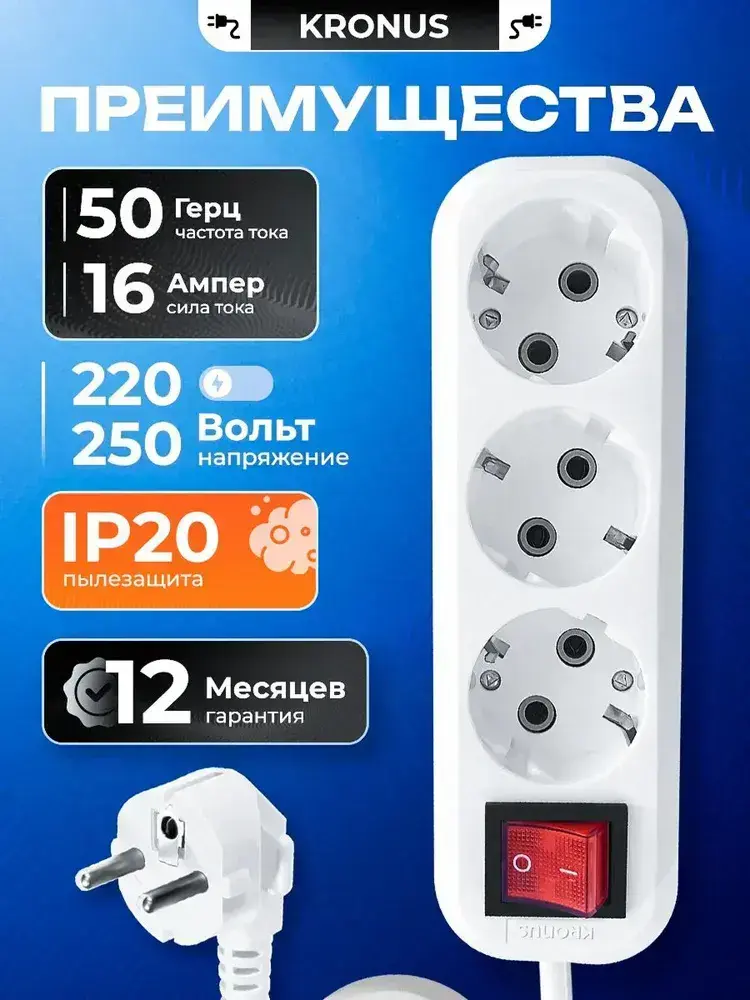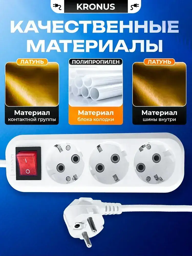 Kronus Удлинитель сетевой 5 м 3 розетки с выключателем и заземлением