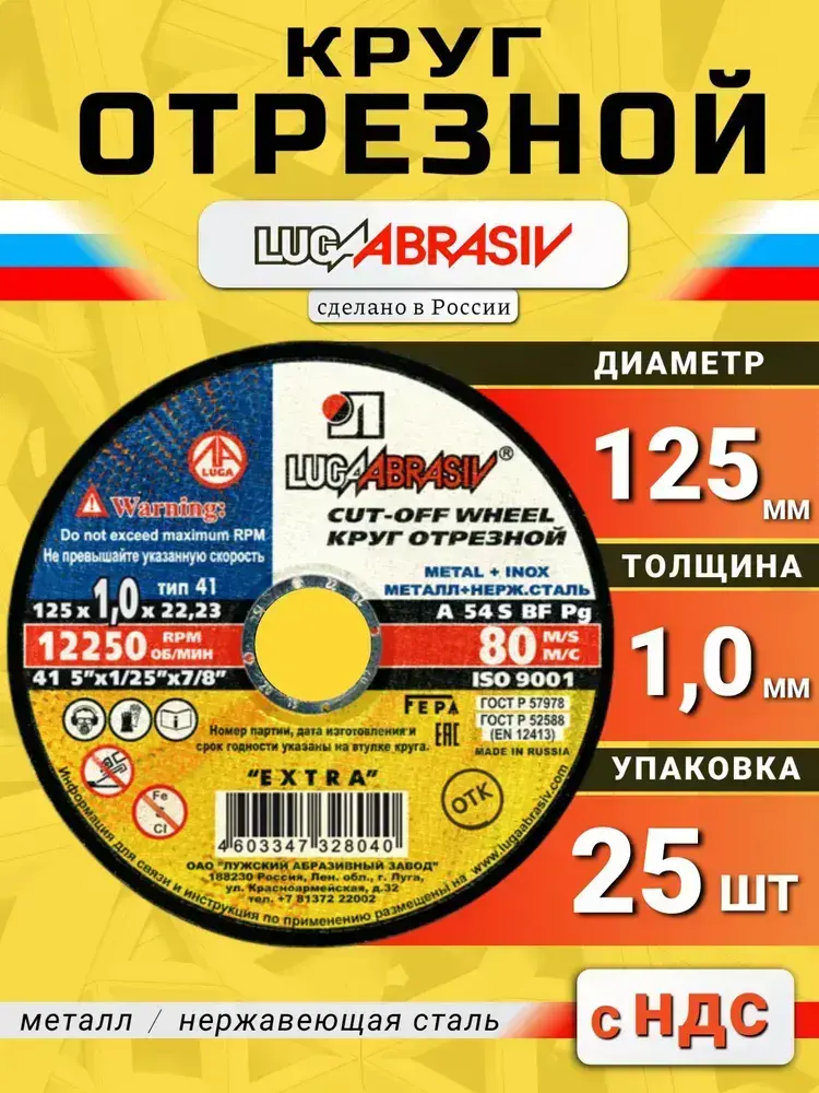 Круг отрезной по металлу 125 х 1,0 х 22,2 "LUGAABRASIV" (25 шт)