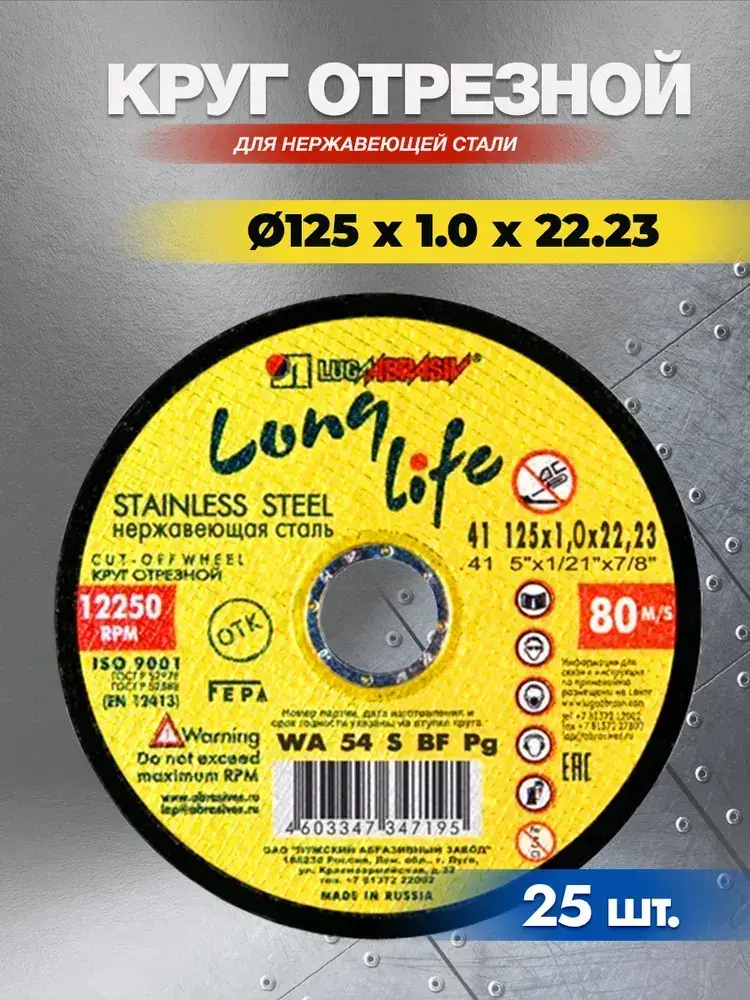 Круг отрезной по нержавейке 125х1.0х22,23 ( 25 шт ) Long Life Луга Абразив