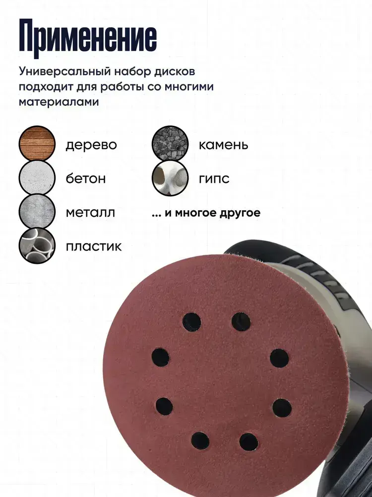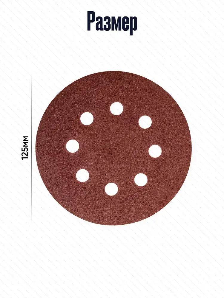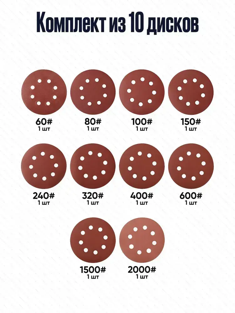 Круг шлифовальный, Диск шлифовальный на липучке с отверстиями 125 мм., 10 шт., по 1 шт. разной зернистости - от Р60 до Р2000