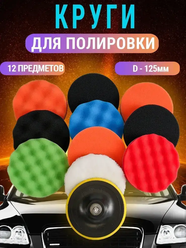 Круги полировальные для авто и фар на липучке 125мм для УШМ и шуруповерта 12 предметов AIDELIFE