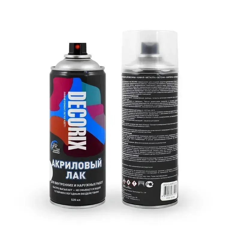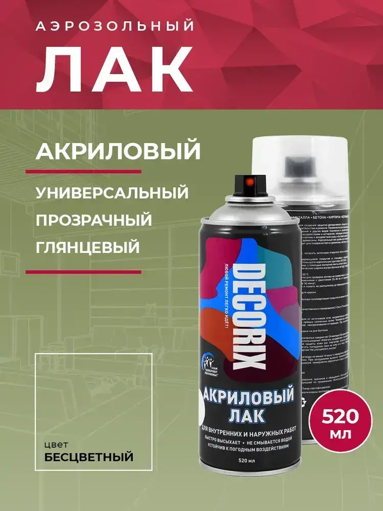Лак акриловый глянцевый аэрозольный DECORIX в баллончике 520 мл прозрачный бесцветный для любых поверхностей