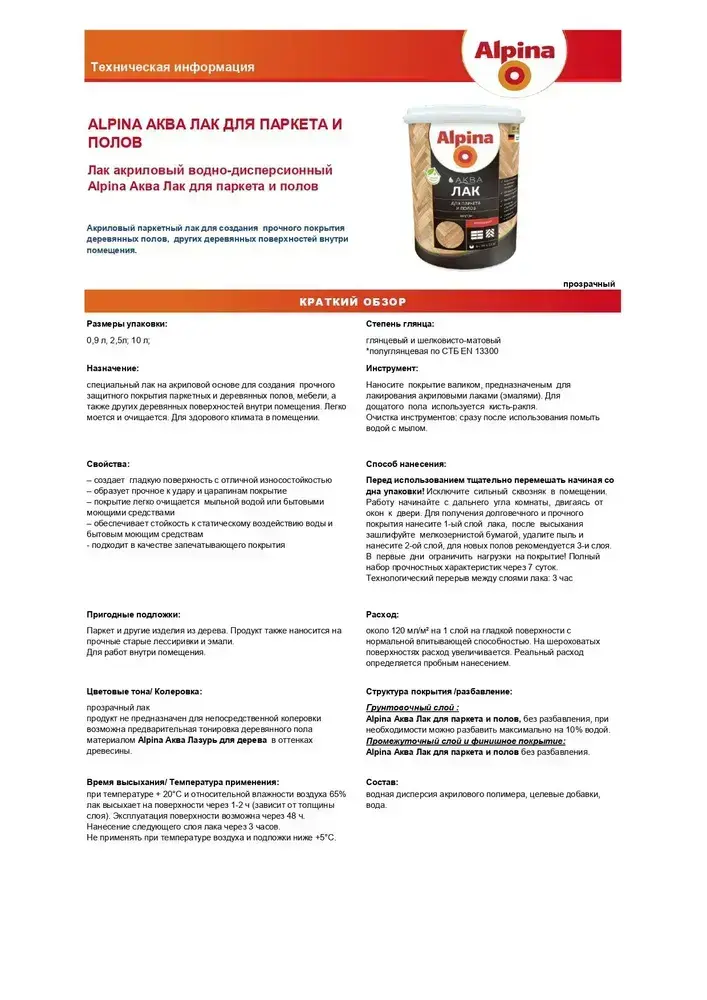 Лак для паркета и полов Alpina Аква шелковисто-матовый 0,9 л