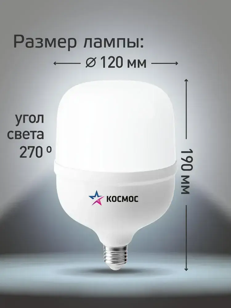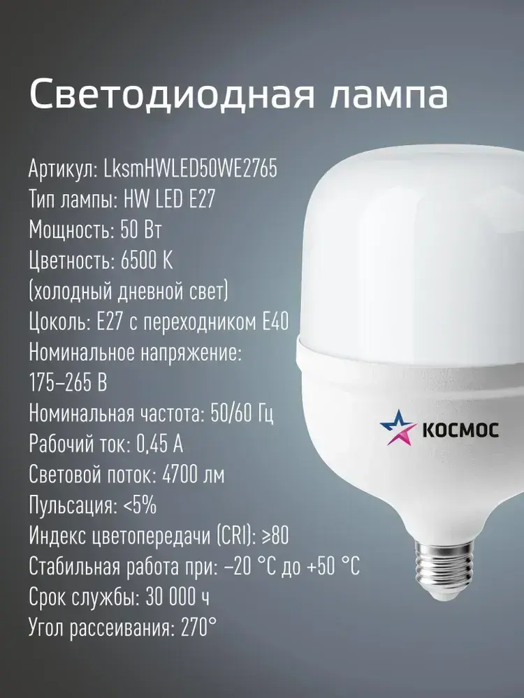 Лампа светодиодная e27 50вт, холодный свет, аналог лампы 400Вт. Переходник Е40 в комплекте.