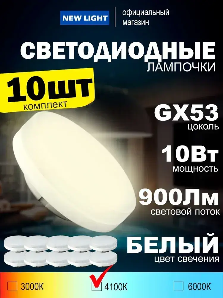 Лампа светодиодная с цоколем GX53 мощностью 10Вт, 4100К нейтральный белый свет, 900Лм, комплект 10шт